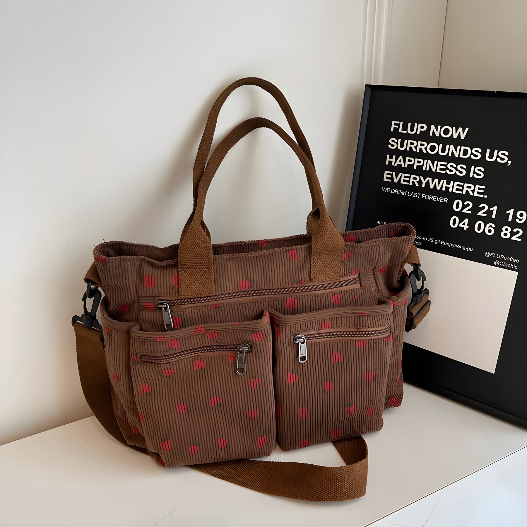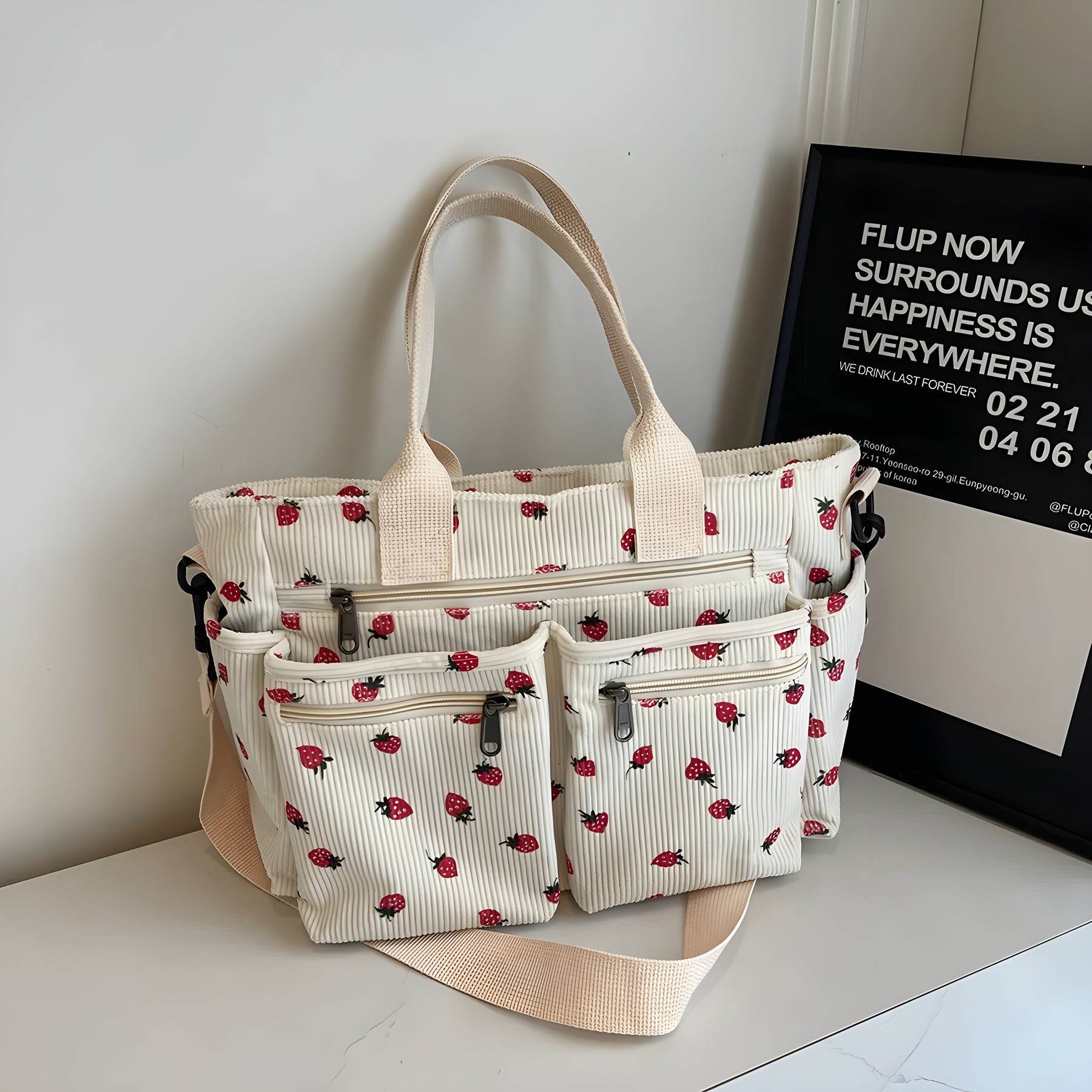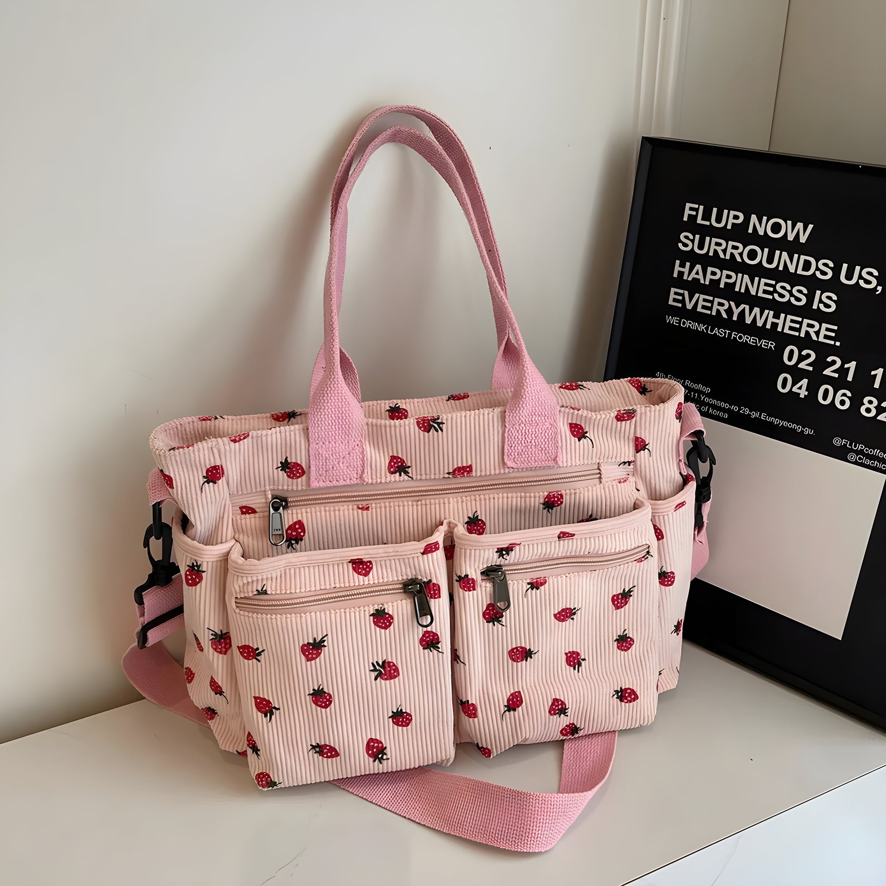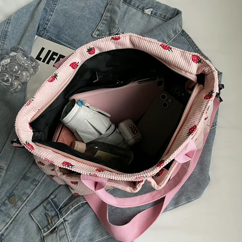 Varför du inte vill missa denna väska: Omedelbar crush-varning! – Mjuk kord och ett lekfullt jordgubbstryck för den ultimata sötfaktorn Tre sätt att bära – Välj själv om du vill bära den som handväska, crossbody eller axelväska Smart förvaring – Praktiska dragkedjefickor håller dina nödvändigheter säkra och organiserade Stiligt när som helst, var som helst – Perfekt för shopping, arbete, skola eller en mysig dag ute